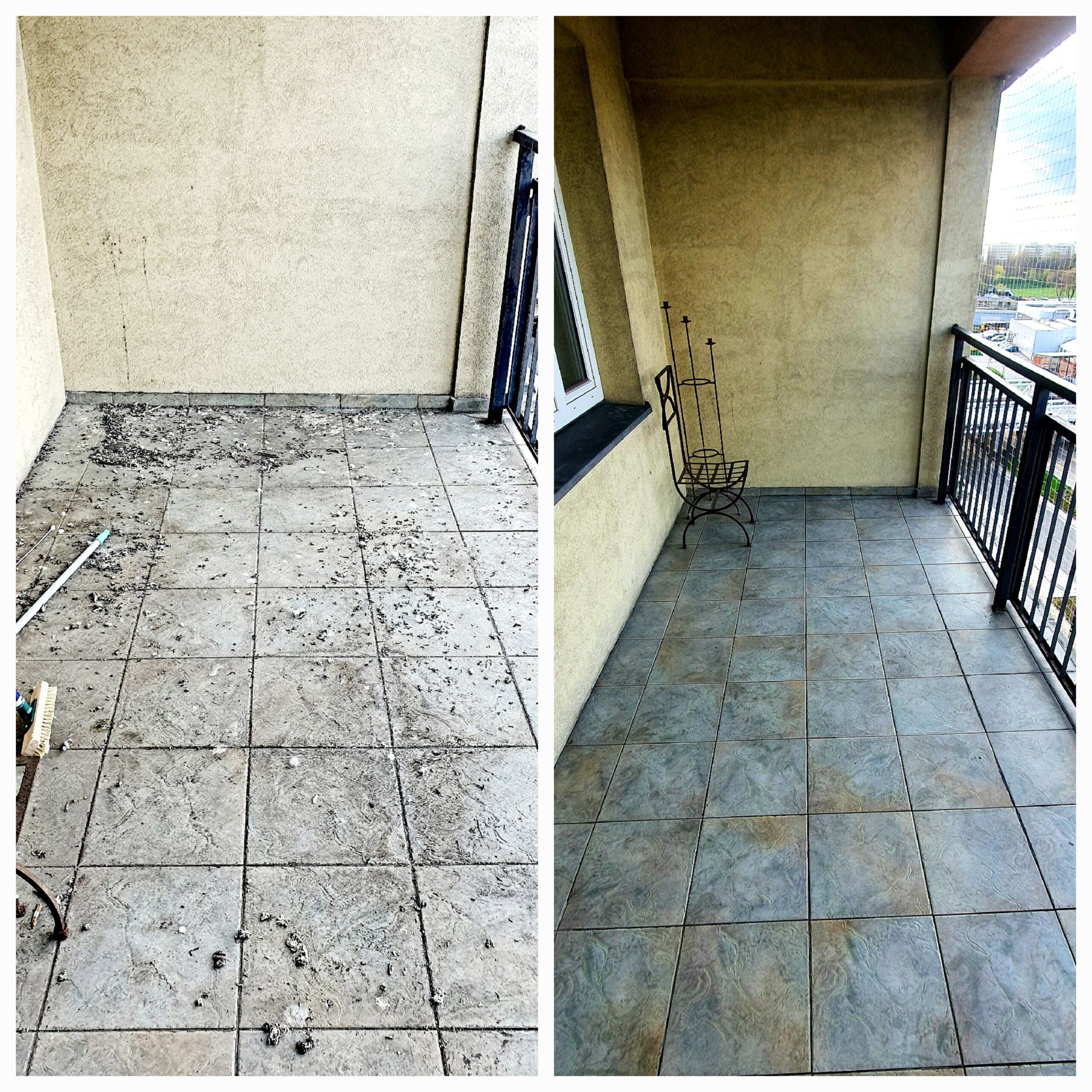 - dezynfekcja balkonów, tarasów i loggii – czyszczenie przestrzeni zanieczyszczonych, odkażanie powierzchni narażonych na kontakt z substancjami organicznymi.
